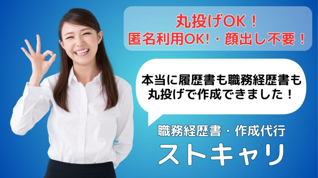 | サービス名 | 【職務経歴書 オンライン 作成代行】転職支援サービス「ストキャリ」 |
