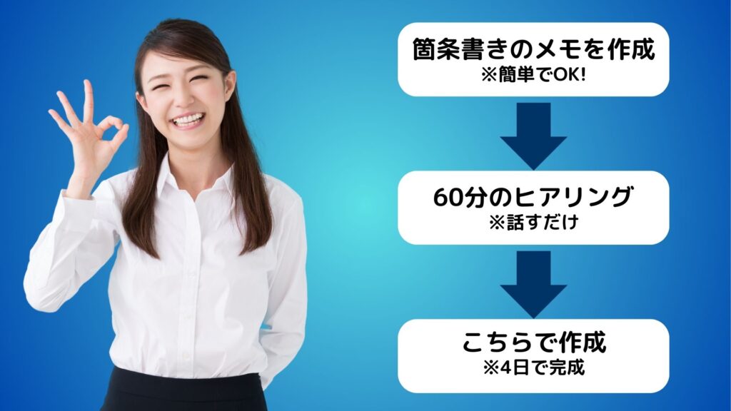- 納期:ヒアリング後、最短4日以内に初稿納品(お急ぎ対応可)